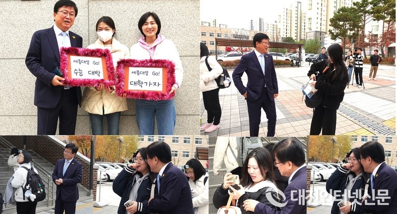최교진 교육감과 선생님들이 수험생을 격려하는 모습 [사진-대전인터넷신문]