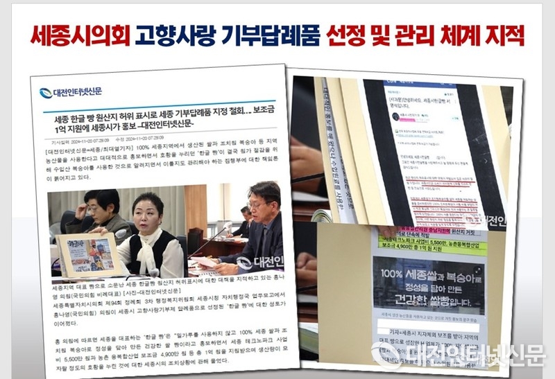 그러면서 홍의원은 세종시가 2배의 성과는 거뒀지만 고향사랑기부제 운용에 있어서 개선이 필요한 점도 존재한다며, 특히 답례품 선정 및 관리의 문제점을 지적했다.