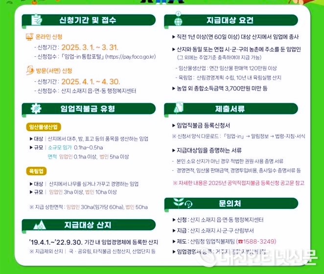 [대전인터넷신문=세종/권혁선 기자] 세종시가 2025년 임업‧산림 공익직접지불금의 신청접수를 지난해보다 1개월 앞당긴 오는 3월 1일부터 4월 30일까지 실시한다.