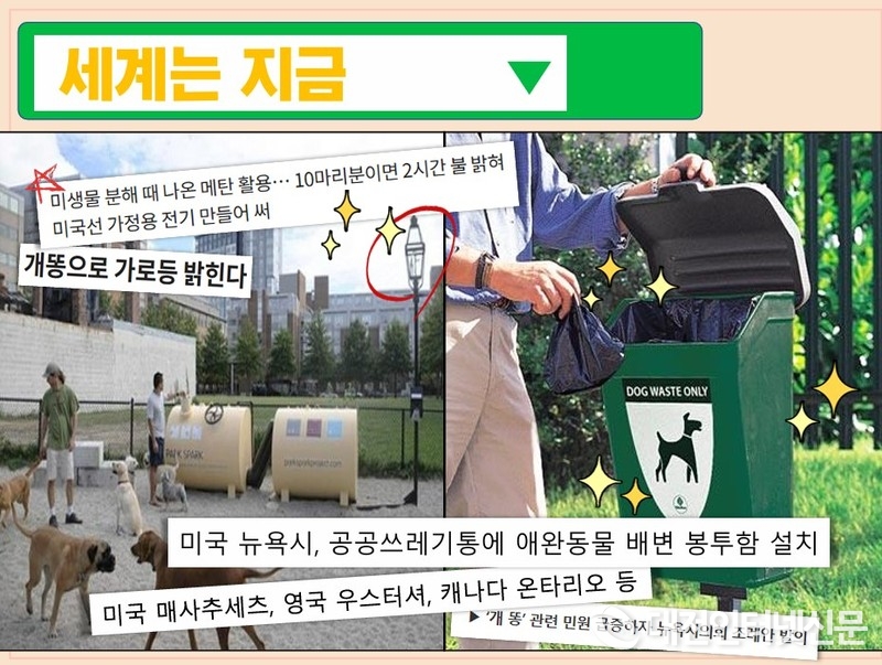 또한 공원에 가면 흔하게 배변수거함을 볼 수 있을 만큼 반려동물 배설물로 인한 사회적 갈등 해소에 노력해 왔다. 미국 뉴욕도 개의 분뇨로 인한 민원이 끊이지 않자 지난해 공공쓰레기통에 애완동물 배변봉투함 설치를 시작했으며, 캐나다의 경우, 공원 3곳에서 수거된 배설물을 메탄가스로 재생산해 가정용 전기를 생산하기도 한다.