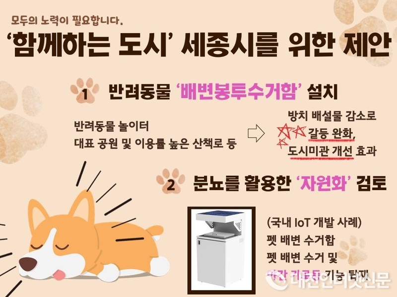 김의원은 반려동물 배변 처리등의 갈등예방으로 반려인이 주로 이용하는 산책로 및 공원 등에 배변수거함을 설치할것을 주장하며 이는 비반려인과의 갈등을 완화하고 도시미관도 개선 될것이라고 제언했다.