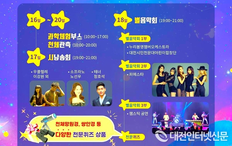 별빛 아래 펼쳐지는 이번 행사에는 누리봄영챔버오케스트라의 클래식 공연을 시작으로, 대전시민천문대 어린이 합창단,가수 피에스타, 잼스틱 밴드의 무대 등 다채로운 문화 공연이 준비되어 있어 시민들에게 특별한 경험을 선사할 예정이다.