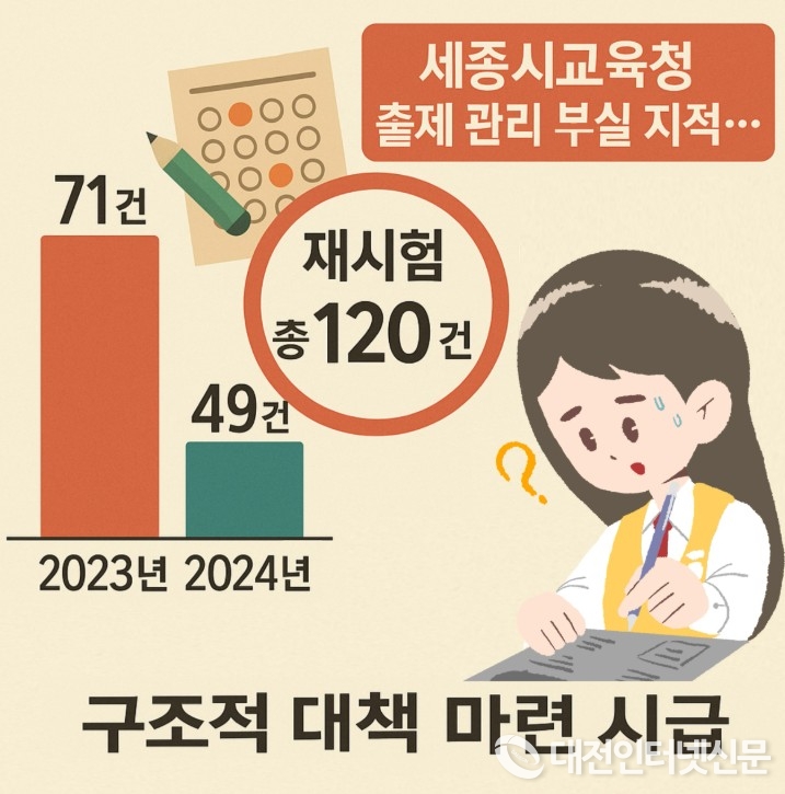 [대전인터넷신문=세종/권혁선 기자] 세종시 중·고등학교에서 최근 2년간 시험 문제 오류로 인한 재시험 건수가 120건에 달하면서 교육 신뢰성에 대한 심각한 우려가 제기되고 있다.