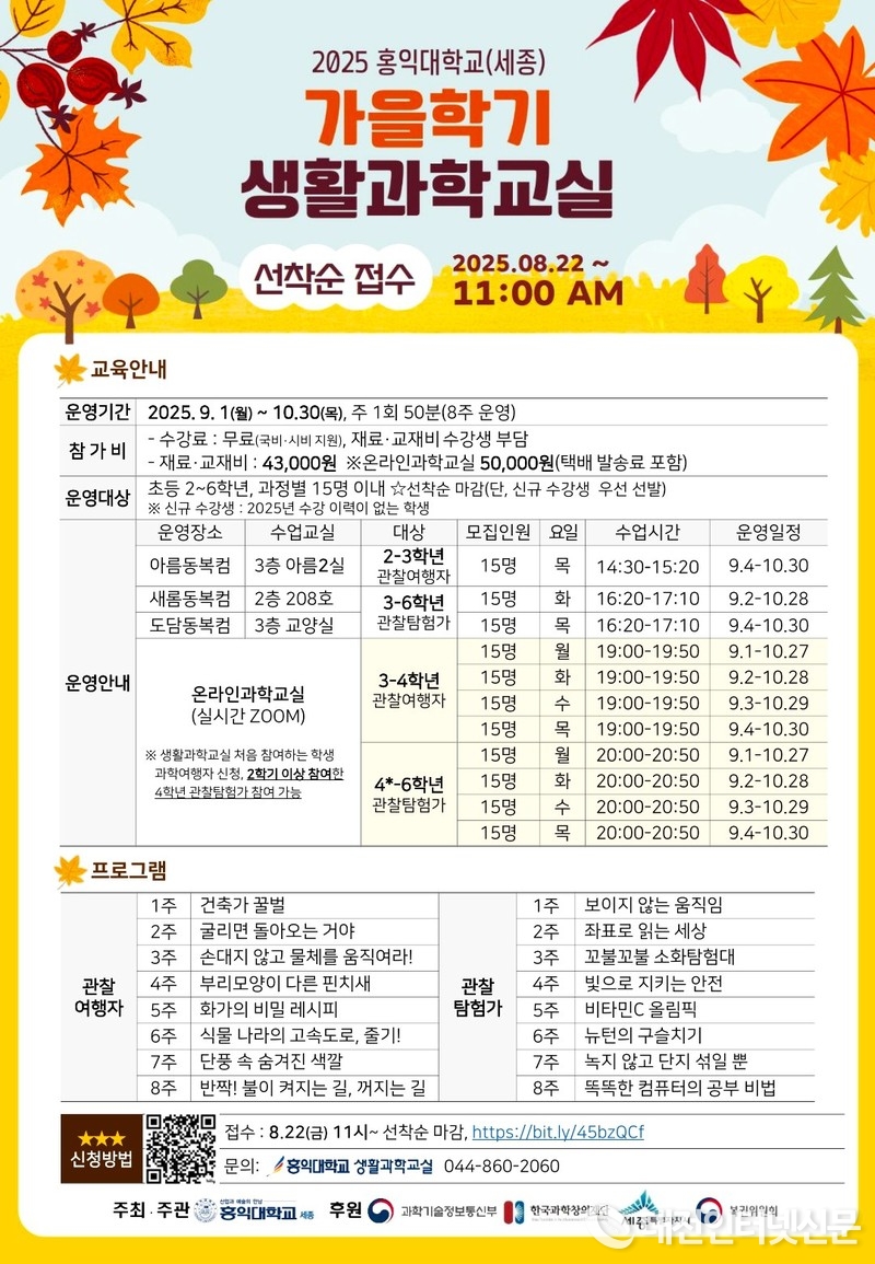 신청은 전용 누리집을 통해 할 수 있으며, 세부 일정과 모집 인원은 카카오톡 채널 ‘홍익대학교 세종캠퍼스 생활과학교실’ 또는 전화로 문의할 수 있다.