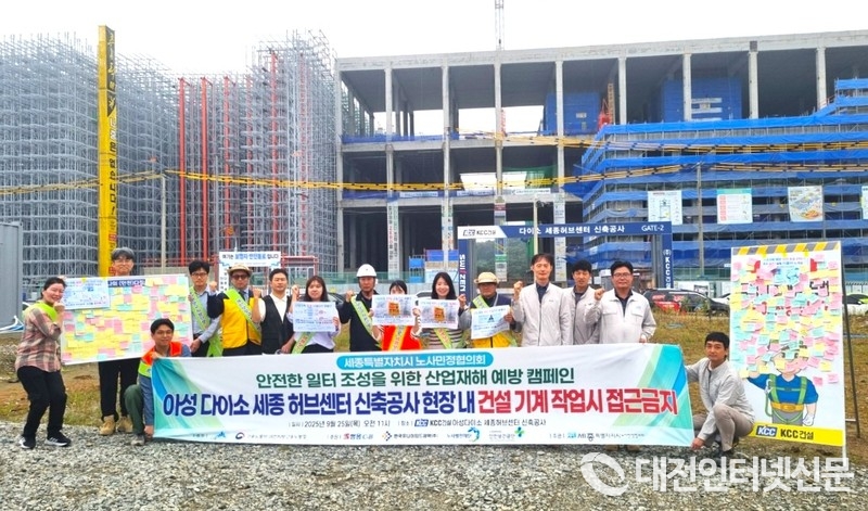 세종시는 25일 아성다이소 세종허브센터 건설현장에서 세종시노사민정협의회와 함께 산업재해 예방 캠페인을 실시했다고 밝혔다. 이번 행사는 건설현장에서 빈번히 발생하는 사고를 예방하고 근로자들의 안전의식을 강화하기 위해 마련됐다.