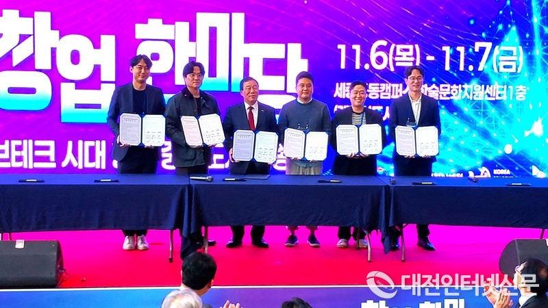 전국 코리아스타트업포럼 회원사와 세종시·관외 창업기업, 유관기관 등에서 150여 명이 참여하는 ‘2025 창업한마당(COMEUP in 세종)’이 6∼7일 집현동 세종공동캠퍼스 학술문화지원센터에서 열린다. 사진은 6일 첫날 개회식에서 세종시, 코리아스타트업포럼, 세종상공회의소가 세종형 창업지원 모델 구축을 위한 업무협약(MOU)을 체결하는 모습. [사진-대전인터넷신문]