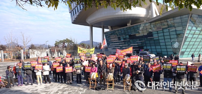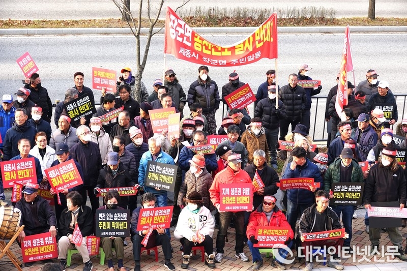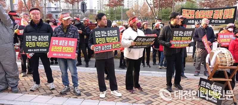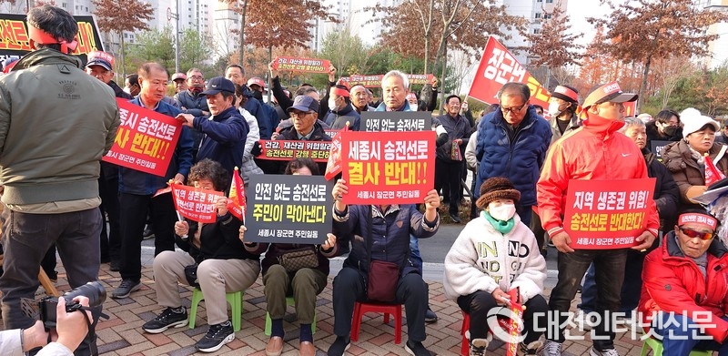 [대전인터넷신문] 신계룡-북천안 송전선로 건설을 둘러싸고 갈등이 고조되는 가운데, 전의·전동·장군면 주민 150여 명이 26일 한전 세종지사와 세종시청 앞에서 송전선로 철회를 촉구하는 집회를 이어갔다. 주민 불신이 확산되는 상황에서 한전이 절차와 대책을 설명하며 반론을 제기했지만, 주민들과의 입장 차는 여전히 좁혀지지 않고 있다.