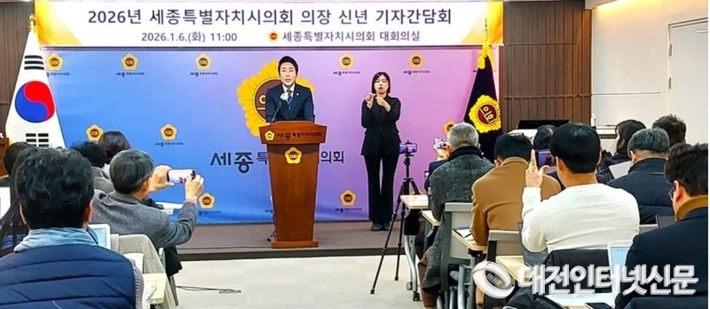 사진은 임채성 세종시의회 의장이 지난 1월 6일 세종시의회 대회의실에서 2026년 신년 기자간담회를 하고 있는 사진임. [사진-대전인터넷신문]