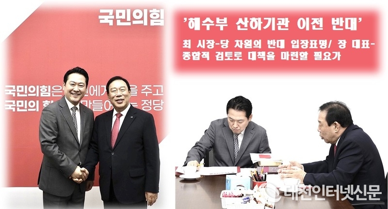 [대전인터넷신문=세종/최대열기자] 최민호 세종시장이 5일 국회에서 장동혁 국민의힘 대표를 만나 해수부 산하기관 이전 반대를 강하게 주장했지만, 장 대표의 답변은 원론적 수준에 머물렀다. 세종시민들은 이번 사안을 두고 “특혜가 아닌 원칙의 준수”를 요구하며 분명한 대책을 촉구하고 있다.