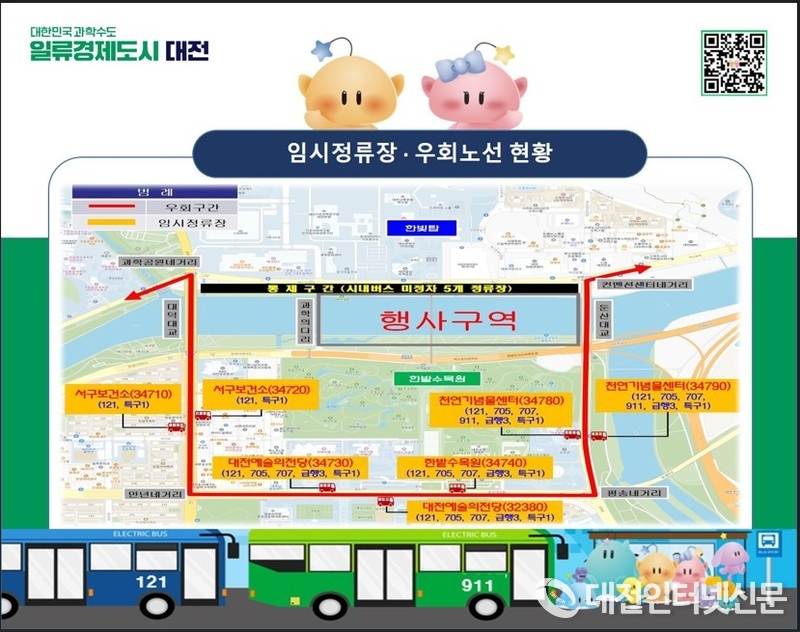 남시덕 대전시 교통국장은 “행사로 인해 일부 시민들의 이동 불편이 예상되는 만큼, 사전에 우회 노선과 미정차 정류장을 확인해 달라”며 “행사의 안전한 진행을 위해 시민 여러분의 협조를 부탁드린다”고 밝혔다.
