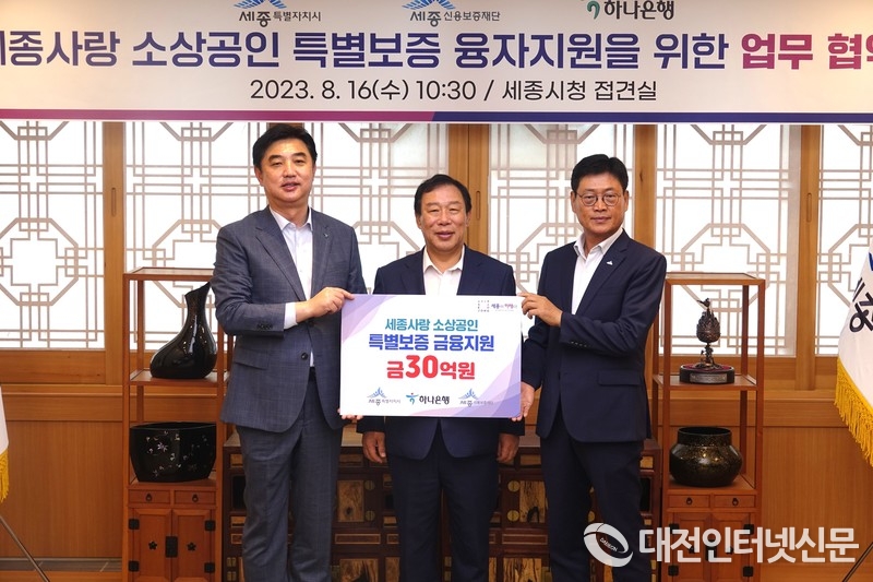 [대전인터넷신문=세종/최대열 기자] 세종시가 16일 시청 접견실에서 하나은행 대전·세종 지역본부와 김호병 세종 신용보증재단 이사장이 참석한 가운데 ‘세종사랑 소상공인 특별보증 금융지원 업무 협약식’을 개최하고 세종지역 소상공인의 재정부담 완화를 통한 경영안정을 도모하는 ‘특별금융지원 업무협약을 체결했다.