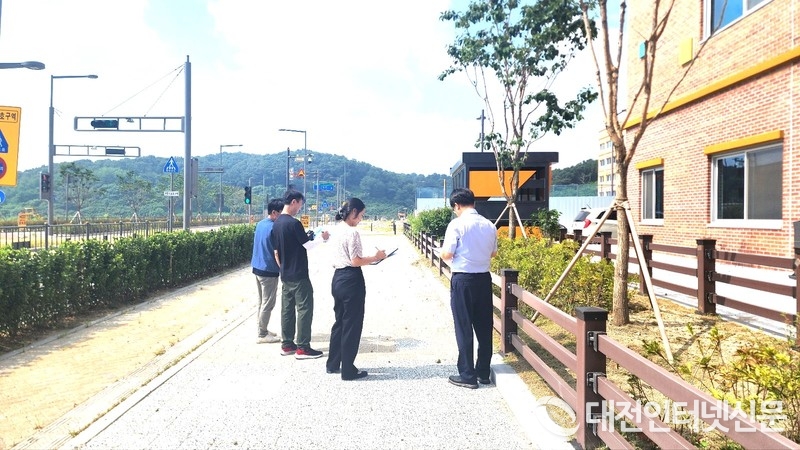 위탁 용역 업체 관계자와 교육청 직원들이 7일에 바른유치원에서 통학로와 교육환경보호구역을 점검하고 있다. [사진-세종시교육청]