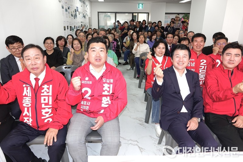 최원석 국민의힘 세종시의원 선거사무소 개소식. [사진-대전인터넷신문]이날 개소식에는 이준배 시당위원장과 정우진 위원장을 비롯해 최민호 후보가 참석했다. 또한 김광운, 윤지성, 김충식 등 현역 시의원들이 함께 자리하며 지역 정치권의 결집 양상을 보였다.