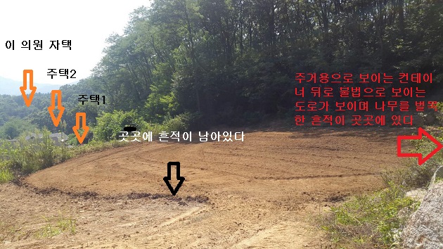 퇴근후 만나자는 약속을 하고 주변 사진 촬영차 현장을 방문하였고 현장에 도착하니 문제의 밭 주변에는 벌목을 하고 방치된 큰 나무들이 곳곳에 방치되어 있었고 밭 위쪽은 평탄작업을 하고 주거용으로 보이는 컨테이너를 설치하였으며 컨테이너 뒤로는 이번에 형성 된것으로 보이는 진입로가 가파르게 형성되어 있었다.