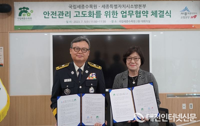 [대전인터넷신문=세종/권혁선 기자] 세종소방본부가 국립세종수목원과 지난 5일 지역 안전문화 확산을 위한 업무협약을 체결했다.