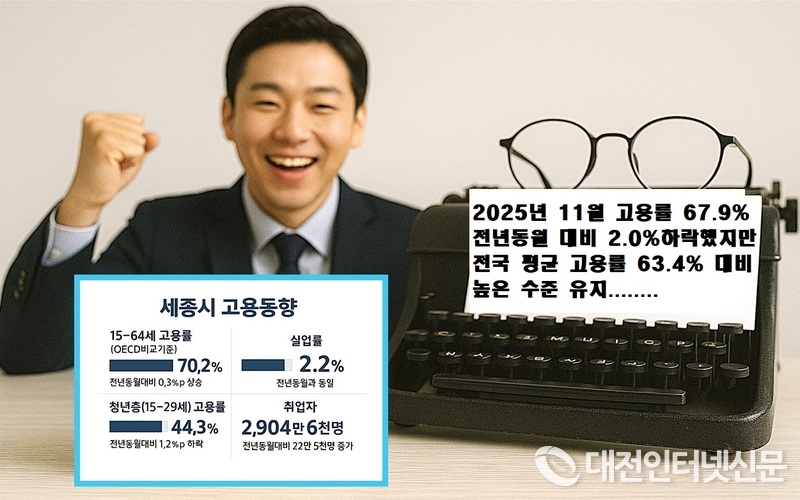 세종시가 2025년 11월 고용률은 전년 동월 대비 2%하락한 64.4%를 나타냈지만 전국 평균63.4%보다 높은 비교적 안정세를 보인 것으로 확인됐다. [제작-대전인터넷신문]